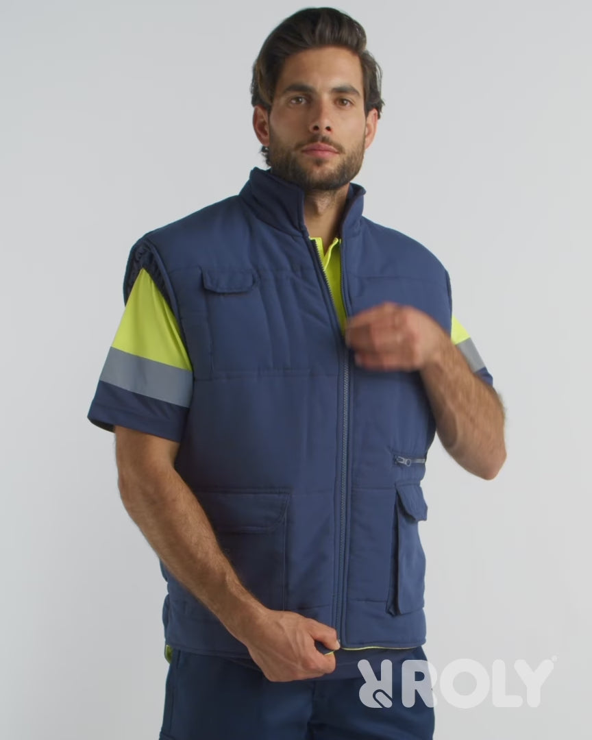 Chaleco reversible multibolsillos y alta visibilidad, con cuello alto. Chaleco multibolsillos. · Cremallera central con tirador reversible. · Un bolsillo exterior para móvil en lado derecho. · Dos bolsillos frontales con fuelle y aberturas laterales. · Dos depósitos para bolígrafos. · Bolsillo cremallera. · Cortavientos en bocamangas. · Bajo posterior con faldón. · Ajustador elástico. Chaleco alta visibilidad · Color fluorescente. · Dos bandas reflectantes horizontales.